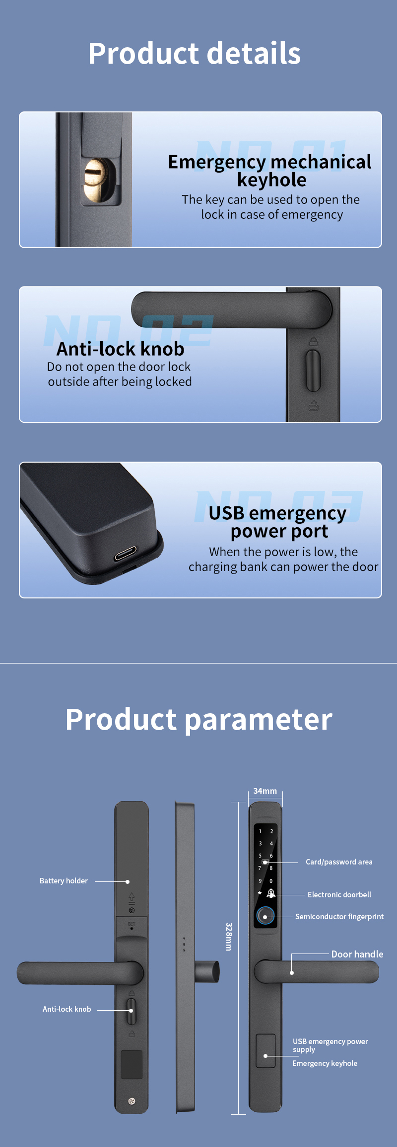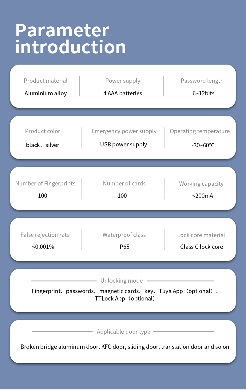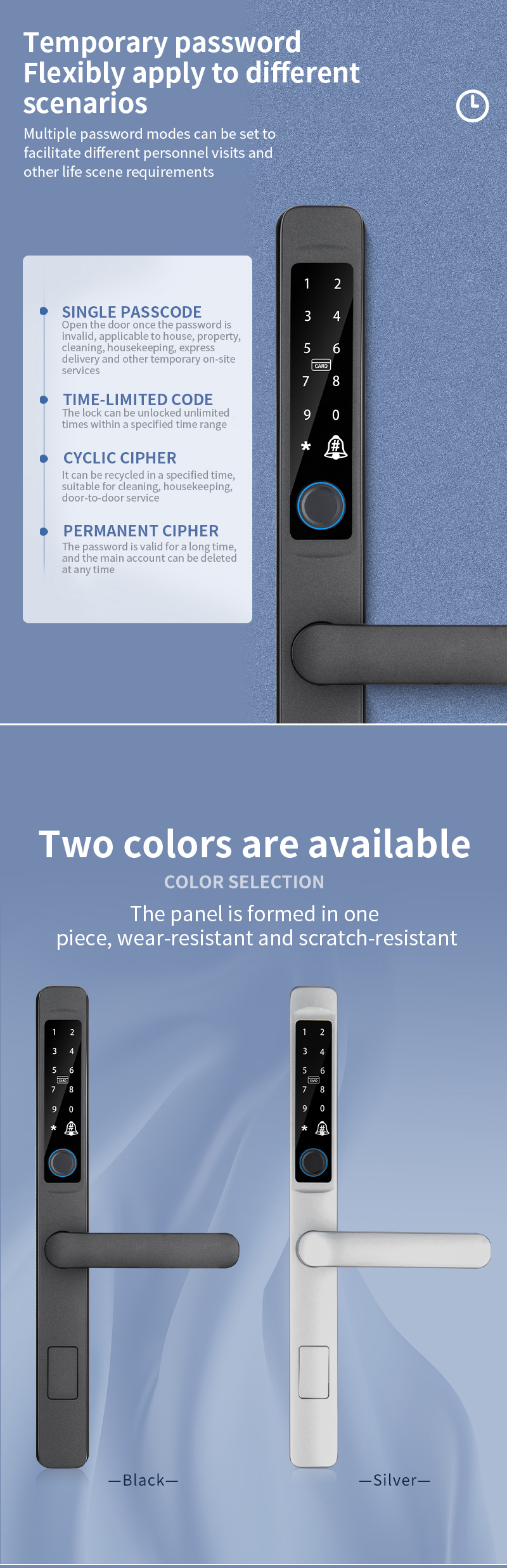 Unlock method: Fingerprint, Password,Card, Key,Tuya/TT