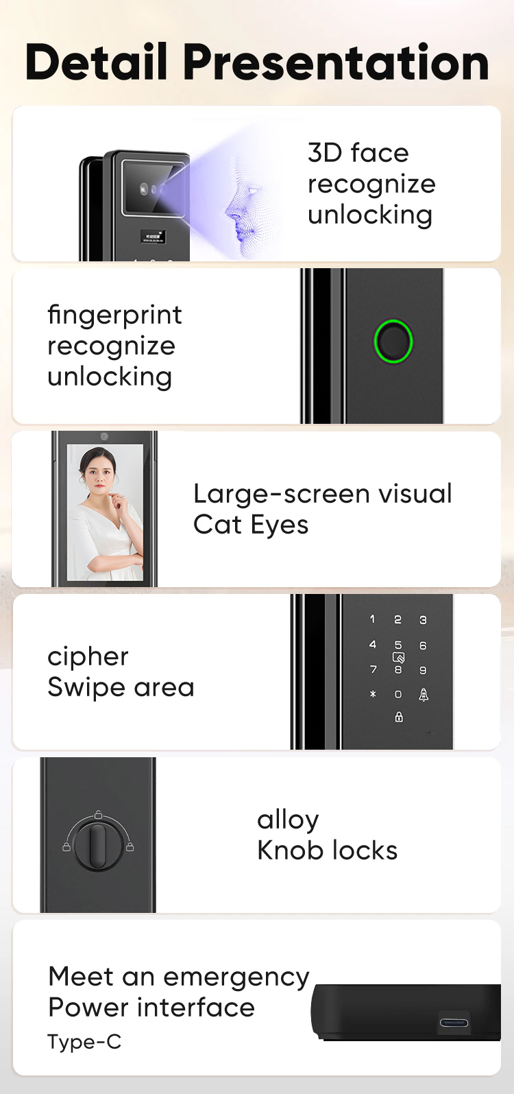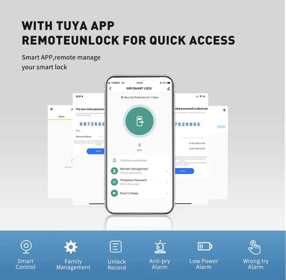 Unlock by: Fingerprint, Key, IC card, Password, App, Face;