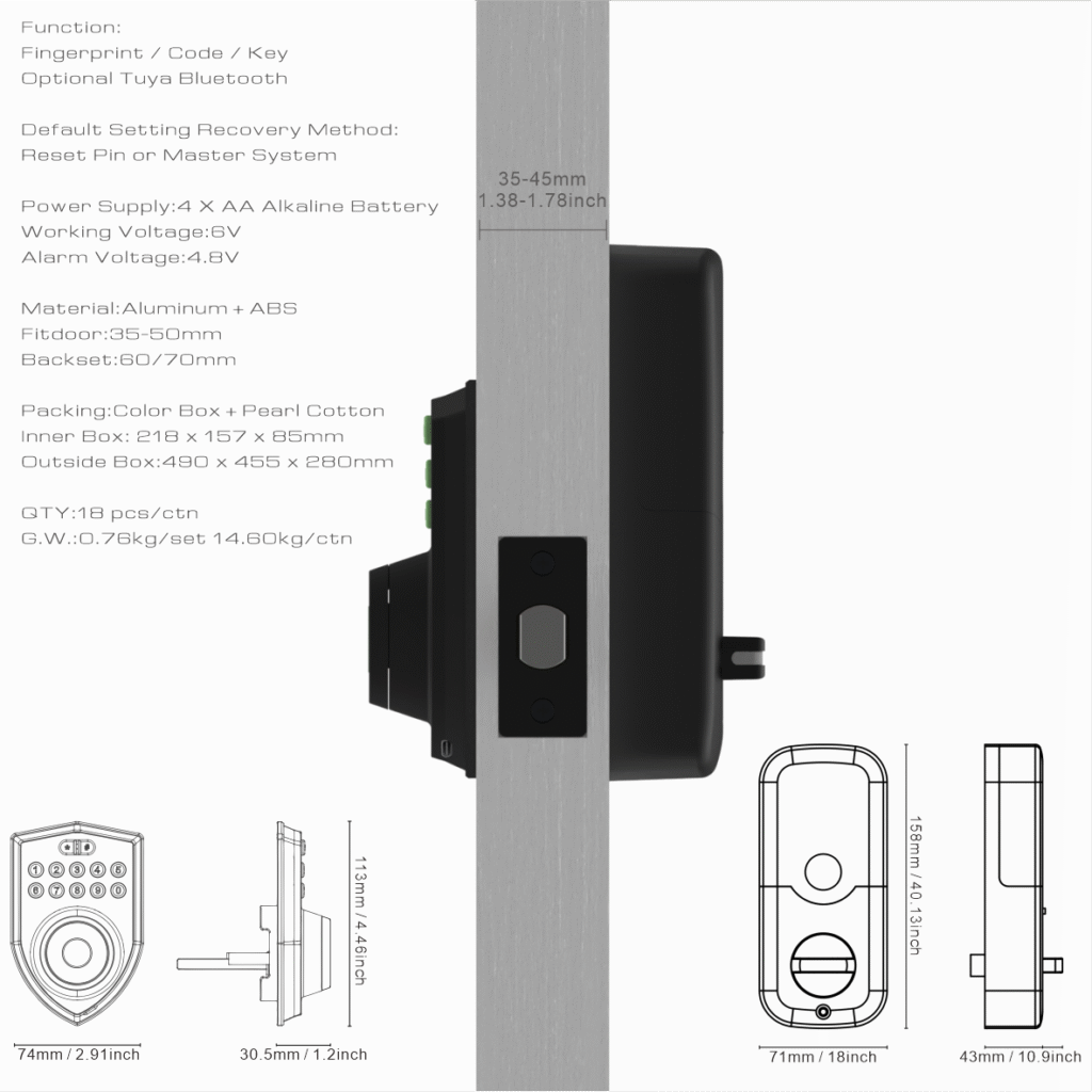 (Fingerprint capacity: 20 pieces) Password capacity: 50 groups Battery: 4AA(1.5V) Alkine Batteries(Not included) Door thickness: 35-45mm