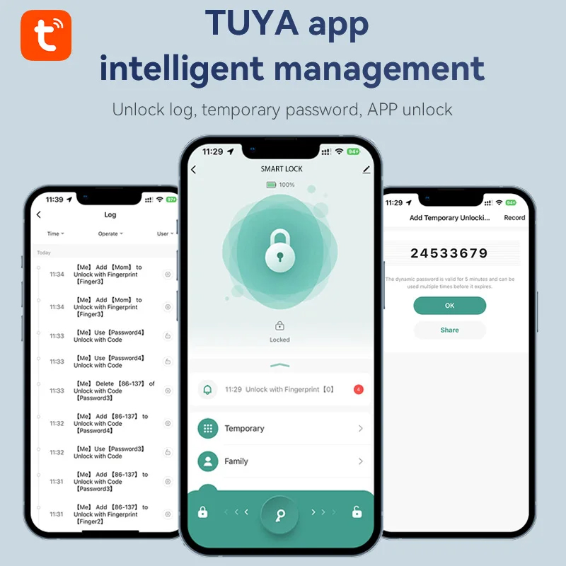 Unlock method: Fingerprint, Password,Card, Key, tuya bluetooth