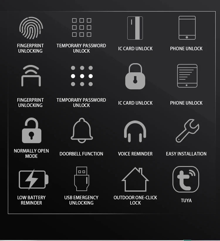 Unlock method: Fingerprint, Password,Card, Key, tuya bluetooth