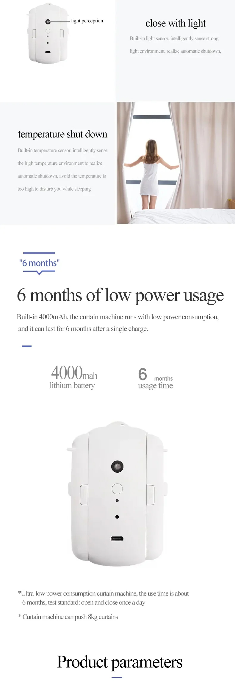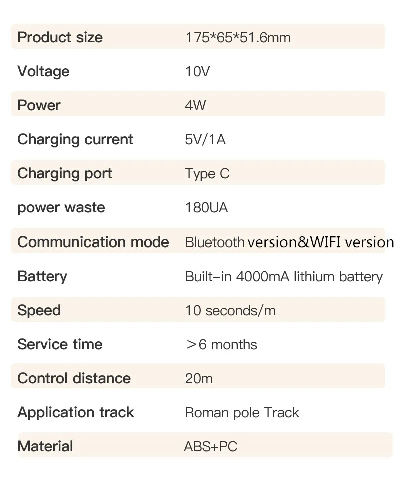 Charging port: Type C Standby power consumption: 180UA Communication mode: WiFi/BL/ZIGBEE Battery: built-in 4000mA Lithium battery Speed: 10 seconds/m